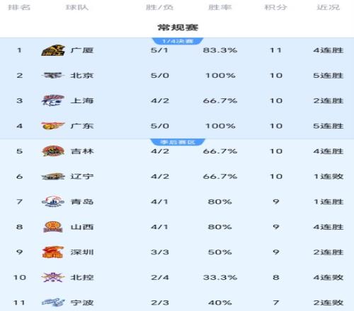 CBA积分榜最新排名出炉!广厦掀翻辽篮冲上第1:广东跌出前四
