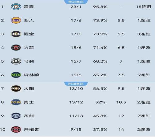 本赛季至今,独行侠仅取得9胜16负排名西部第11,暂时落后西部第十的开拓者0.5个胜场,森林狼则以15胜8负排名西部第六,落后西部第五的马刺0.5个胜场。
