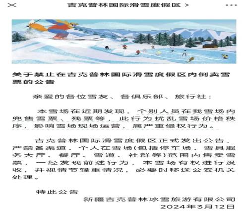 ▲ 新疆吉克普林滑雪场曾经发布公告禁止倒卖雪票。图 / 吉克普林国际滑雪度假区公众号