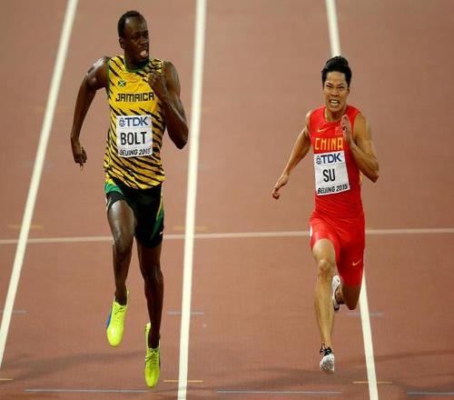 2015年8月23日,北京,2015田径世锦赛男子100米半决赛,苏炳添与博尔特等冲刺。图:视觉中国